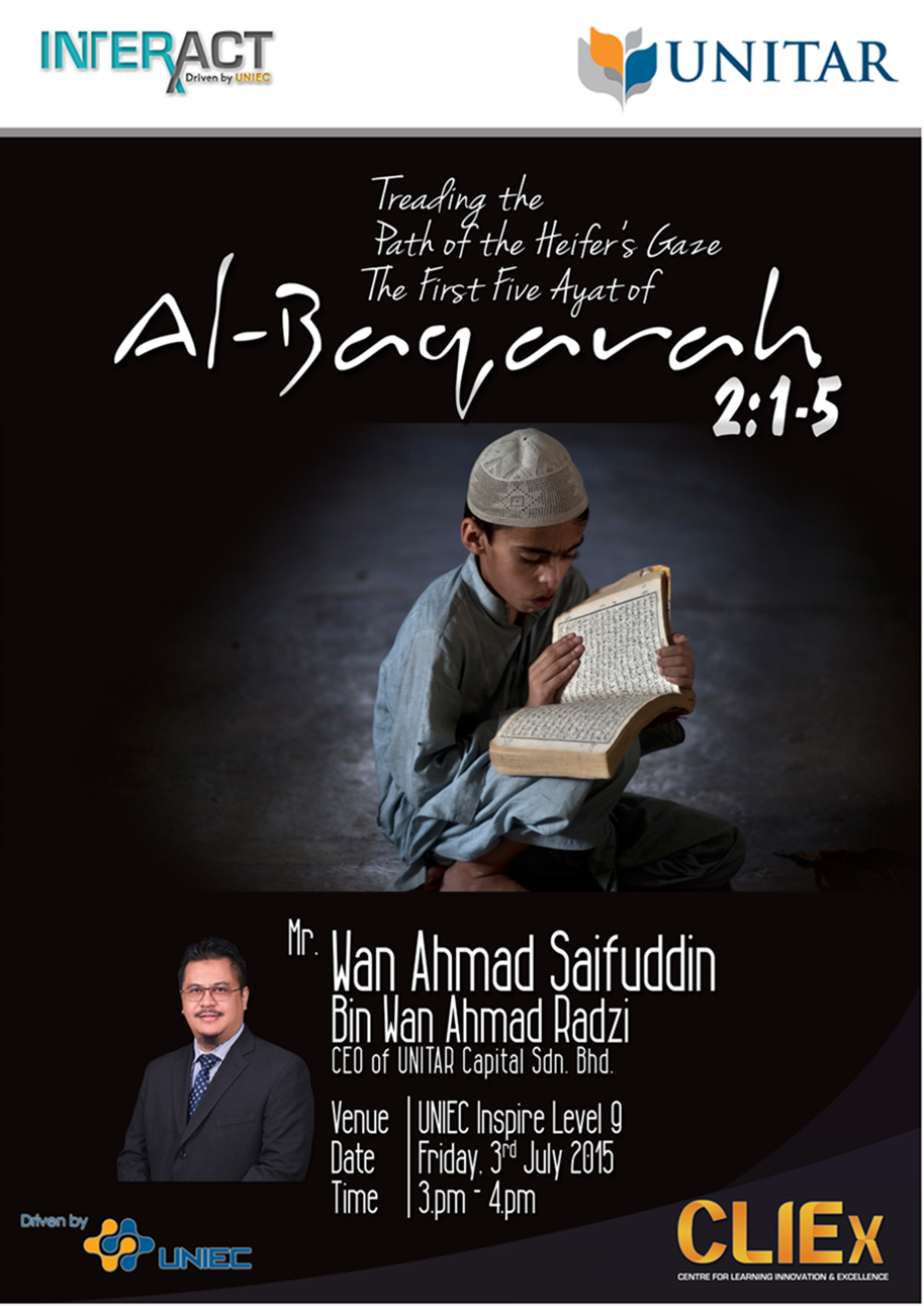 For those who are interested, I will be giving a talk entitled “Treading the Path of the Heifer’s Gaze: The first Five Ayat of Surah Al-Baqarah” in two week’s time at 3-4pm on 3rd July at UNIEC Inspire, Level 9, UNITAR Kelana Jaya Campus.